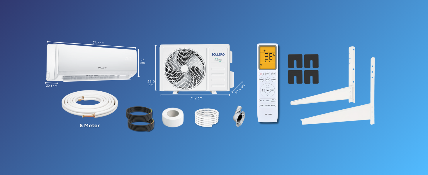 Een Sollero split-airco bestaat uit een binnen- en buiteneenheid. De installatie moet door een gecertificeerde vakman gebeuren, vooral vanwege de koudemiddelcircuitverbindingen.