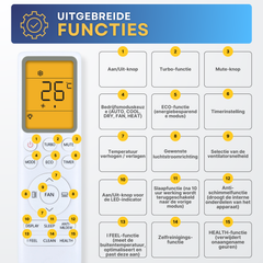 Buitendeel: Weerbestendig en trillingsgedempt voor een stille werking. De airco benut omgevingswarmte om te verwarmen, zelfs bij lage buitentemperaturen tot -15 °C, en voert warmte tijdens het koelen efficiënt naar buiten af.