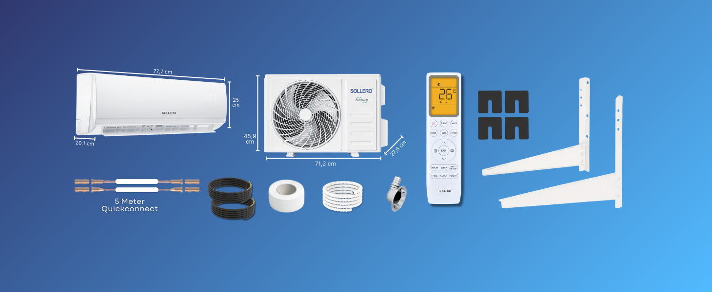 Een Sollero split-airco bestaat uit een binnen- en buiteneenheid. De installatie moet door een gecertificeerde vakman gebeuren, vooral vanwege de koudemiddelcircuitverbindingen.